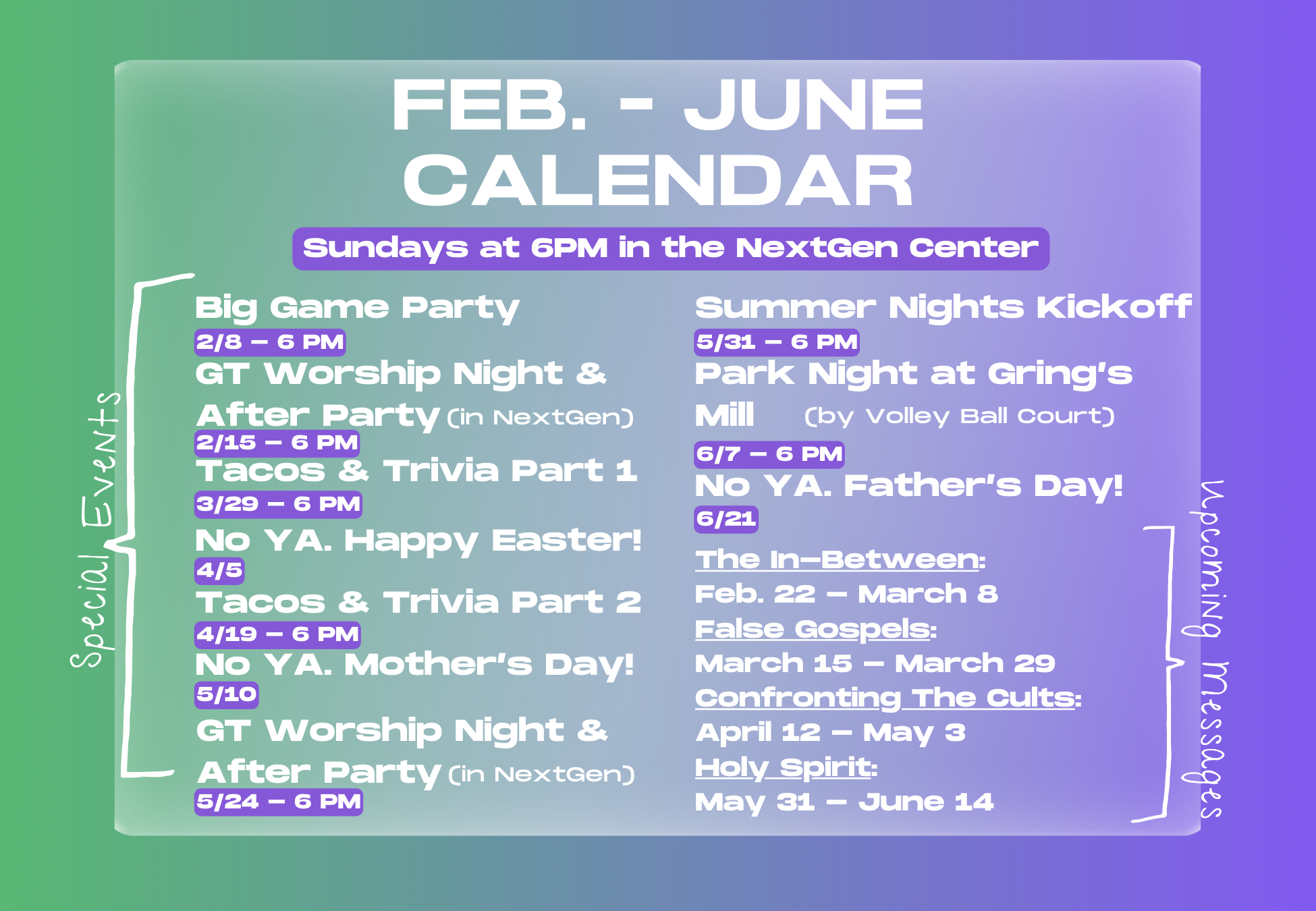 GT Young Adults exists to help 18-25-year-olds build authentic, God-centered community. Whether you’re a college student, working, or figuring out your next step, you belong here! We gather every Sunday evening from 6:00–8:00 PM in the NextGen Center for a night filled with games, worship, a relevant message, small group discussions, and time to connect. We also host fun events throughout the year to grow together and make lasting memories. Stay connected through Instagram, GroupMe, and our calendar below — we’d love to see you soon!